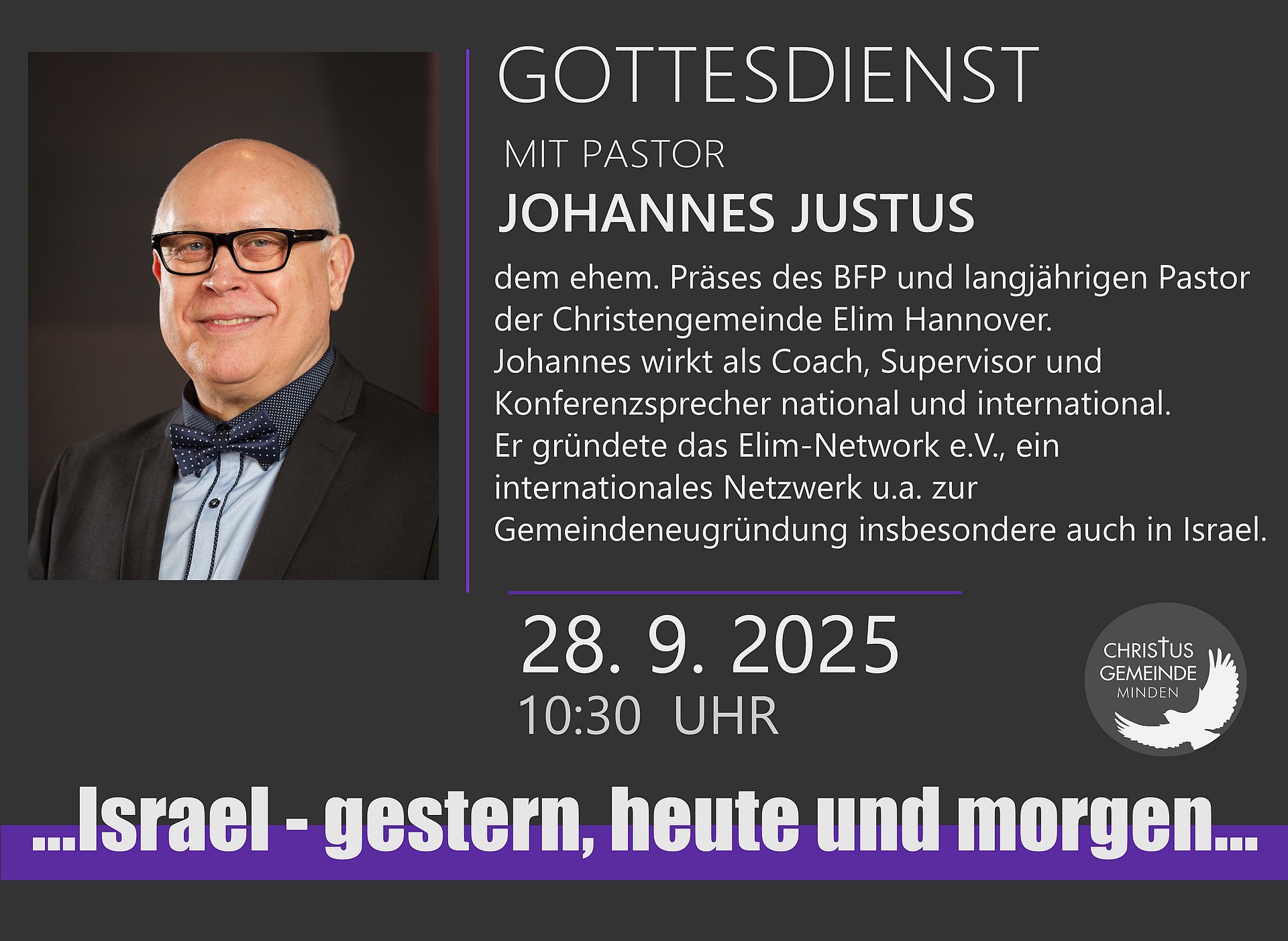Wir freuen uns auf einen Gottesdienst mit Pastor Johannes Justus, ehem. Präses unseres Bundes BFP und aktuell mit vielen spannenden Arbeiten für Gott unterwegs. Sei dabei!